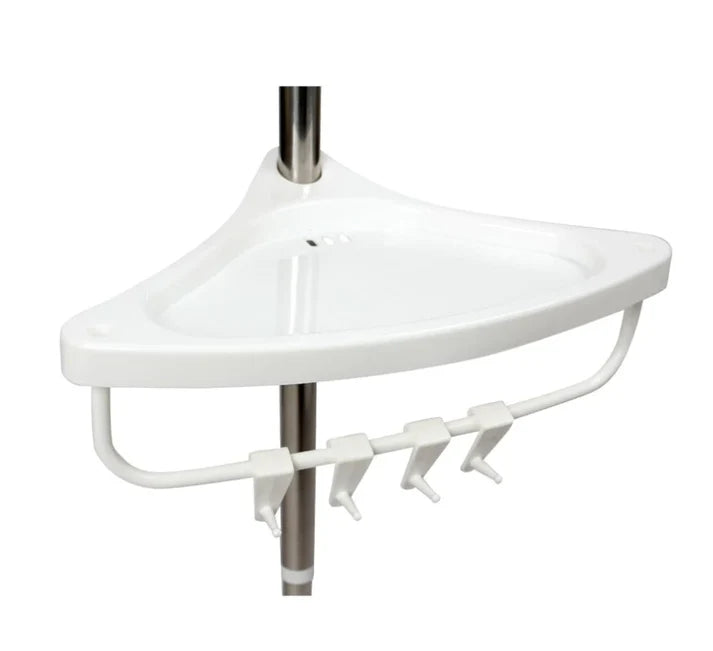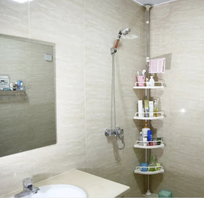 Na hromiranom teleskopskom stubu nalaze se 4 police za odlaganje, i vešalica čiji razmak izmedju polica možete podešavati po vašim potrebama. Ovde možete staviti šampon, sapun ili druge proizvode za negu.